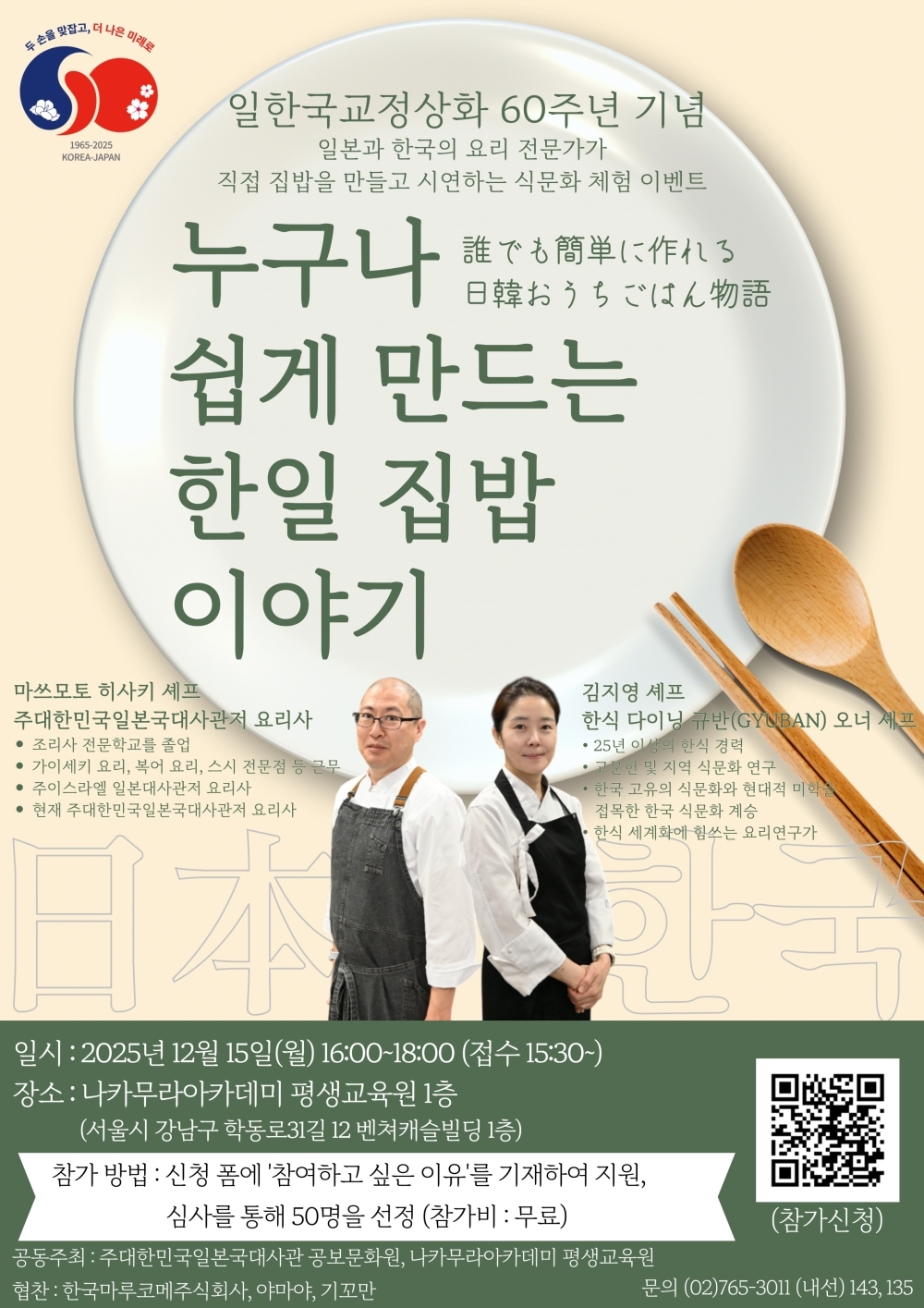2025年12月15日(月)、在大韓民国日本国大使館公報文化院とナカムラアカデミー平生教育院は、日韓国交正常化60周年を記念し、日韓の料理人による家庭料理デモンストレーションと試食を通じて両国の食文化を体験する交流イベント「誰でも簡単に作れる日韓おうちごはん物語」を開催します。