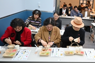 この日、日本と韓国を代表する料理専門家である松本寿基料理人(在大韓民国日本国大使公邸料理人 )と、キム・ジヨンシェフ(韓食ダイニング GYUBAN オーナーシェフ )が、両国料理の違いと共通点を紹介しながら、日韓それぞれの「おうちごはん」のデモンストレーションを行いました。参加者は紹介されたメニューを試食しながら両国の食文化の魅力を比較・体験する時間を過ごしました。また、満19歳以上の参加者を対象に、日本酒と韓国伝統酒、各3種類の試飲も行われました。