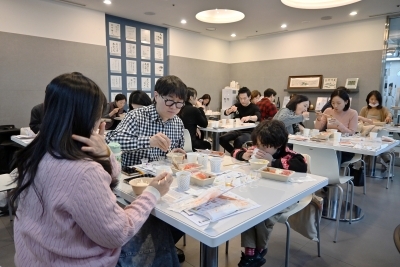 | 両国のおうちごはんを、 日本酒・韓国伝統酒とともに試食する参加者らの様子 |