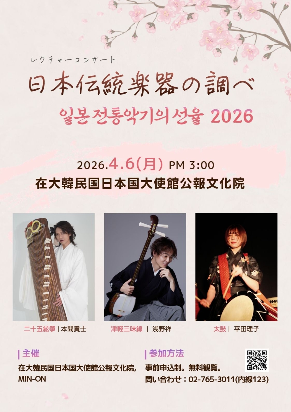 この度、在大韓民国日本国大使館公報文化院にて、レクチャー・コンサート「日本伝統楽器の調べ2026」を開催いたします。 今回のコンサートには、史上最年少で津軽三味線全国大会A級優勝を果たし、トップ奏者として活躍する実力派の津軽三味線奏者・浅野祥、さらにメディア出演や舞台・映画作品への参加経験も豊富な二十五絃箏の本間貴士、そして映画出演や海外公演など活動の幅を広げている太鼓の平田理子が出演します。 津軽三味線の力強い音色、二十五絃箏の豊かな響き、太鼓の躍動感あふれるリズムが織りなす多彩な表現を、わかりやすいトークとともにお楽しみいただけます。日本の伝統音楽に初めて触れる方にも親しみやすい内容となっております。 若手奏者たちの情熱と日本音楽の魅力が詰まった貴重な舞台に、ぜひ皆さまをお招きしたいと存じます。皆さまのご来場を心よりお待ち申し上げております。