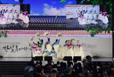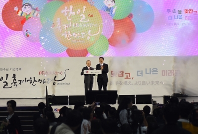 おまつりでは、孫京植(ソン・ギョンシク)日韓交流おまつり韓国側実行委員長と小路明善日本側実行委員長による挨拶及び開会宣言の後、水嶋光一駐大韓民国日本国特命全権大使の祝辞がありました。また、崔輝永(チュ・ヒヨン)文化体育観光部長官、金珍我(キム・ジナ)外交部第2次長官、閔洪喆(ミン・ホンチョル)韓日議員連盟副会長、金碩基(キム・ソッキ)韓日議員連盟副会長から祝辞を頂きました。