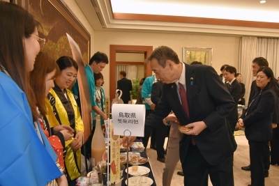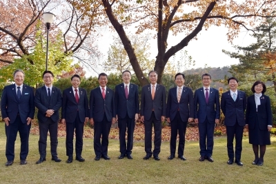 | 방한 지사 부지사들의 단체 사진 (왼쪽에서 노로 유키토시 미에현 부지사, 고토다 마사즈미 도쿠시마현 지사, 핫토리 세이타로 후쿠오카현 지사, 무라이 요시히로 미야기현 지사, 미즈시마 코이치 대사, 아베 슈이치 나가노현 지사, 닷소 다쿠야 이와테현 지사, 고노 슌지 미야자키현 지사, 이바라기 류타 오카야마현 지사, 나카하라 미유키 돗토리현 부지사) |