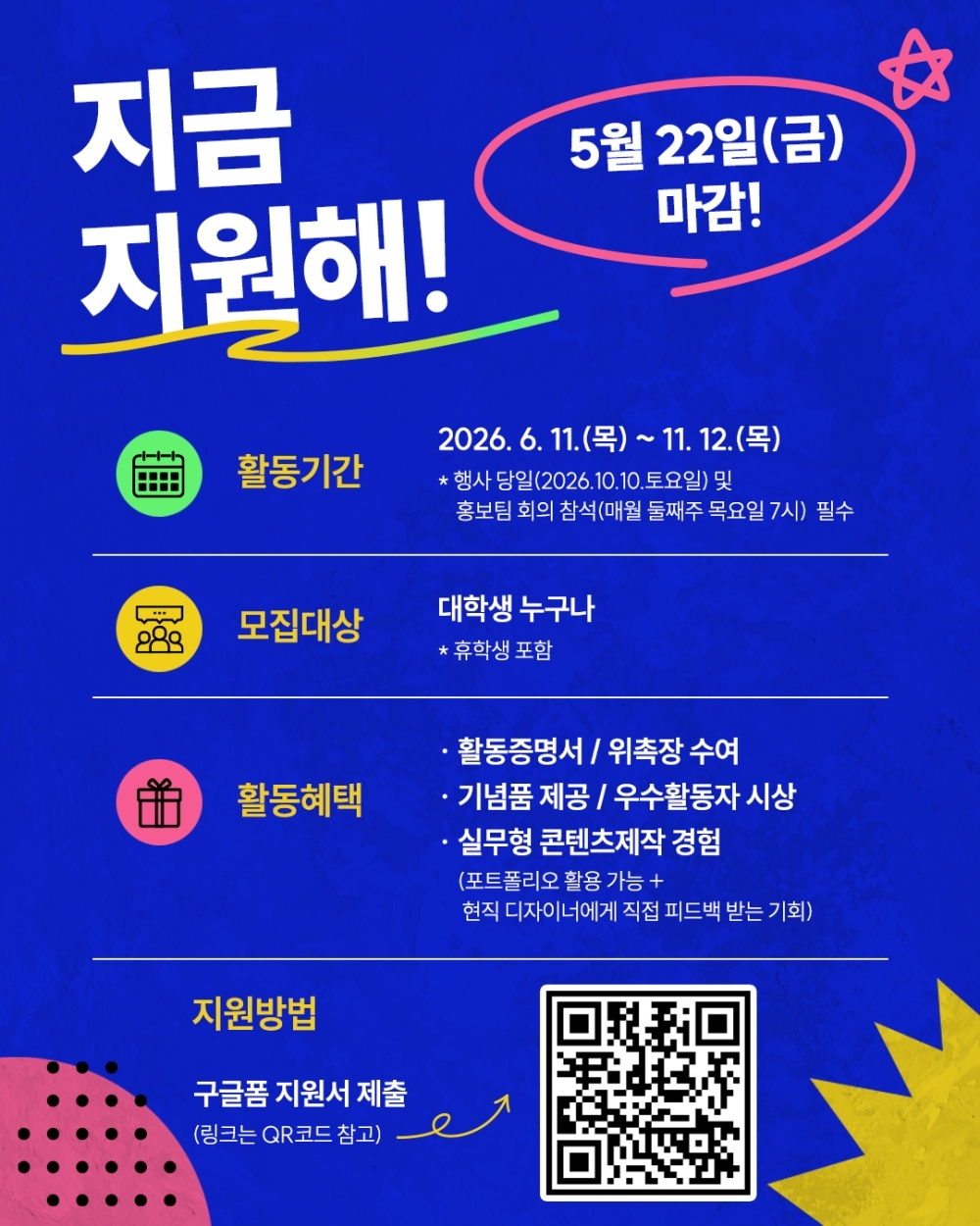 | - 구글폼 지원서 제출 - 기본 인적사항 및 지원동기 작성 - 홍보 운영위원으로서 활동 계획 간단 작성 (자유 형식, 3~5줄 내외) (예: 콘텐츠 아이디어, SNS 운영 방향, 참여 목표 등) |